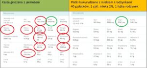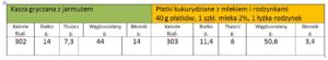 Moja potrawa jest zdecydowanie lepszym źródłem wielonienasyconych kwasów tłuszczowych. Pula aminokwasów jest do siebie bardzo zbliżona. W kaszy znajduje się więcej cysteiny, tryptofanu, argininy, glicyny, kwasu asparaginowego. W płatkach z mlekiem znajduje się o wiele więcej proliny i metioniny. Niestety będą ona także źródłem niepotrzebnych cukrów prostych (wysoki IG), emulgatorów, czy konserwantów. Wysoka zawartość witamin z grupy B oraz żelaza wynika z tego, że są to produkty często fortyfikowane czyli sztucznie wzbogacane te składniki.