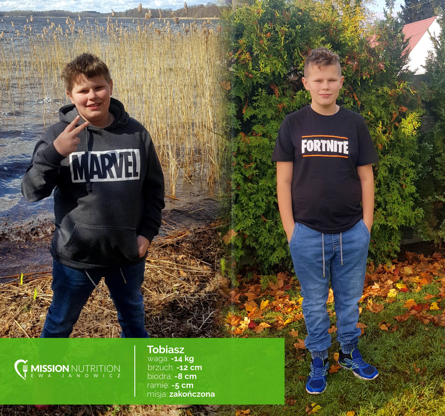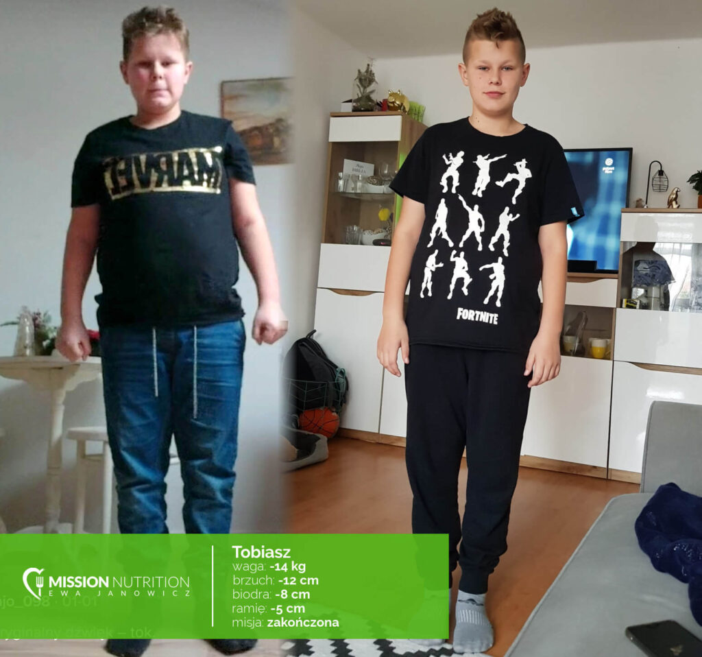 Tobiasz po schudnięciu ma więcej energii i siły. Bardzo chętnie wychodzi z kolegami grać w piłkę czy jeździć na rowerze . Wręcz pokochał W-F 🙂 .Teraz już wiemy, że było warto – najtrudniej jest zacząć, ale kiedy początki są już za nami wszystko staje się prostsze i łatwiejsze.