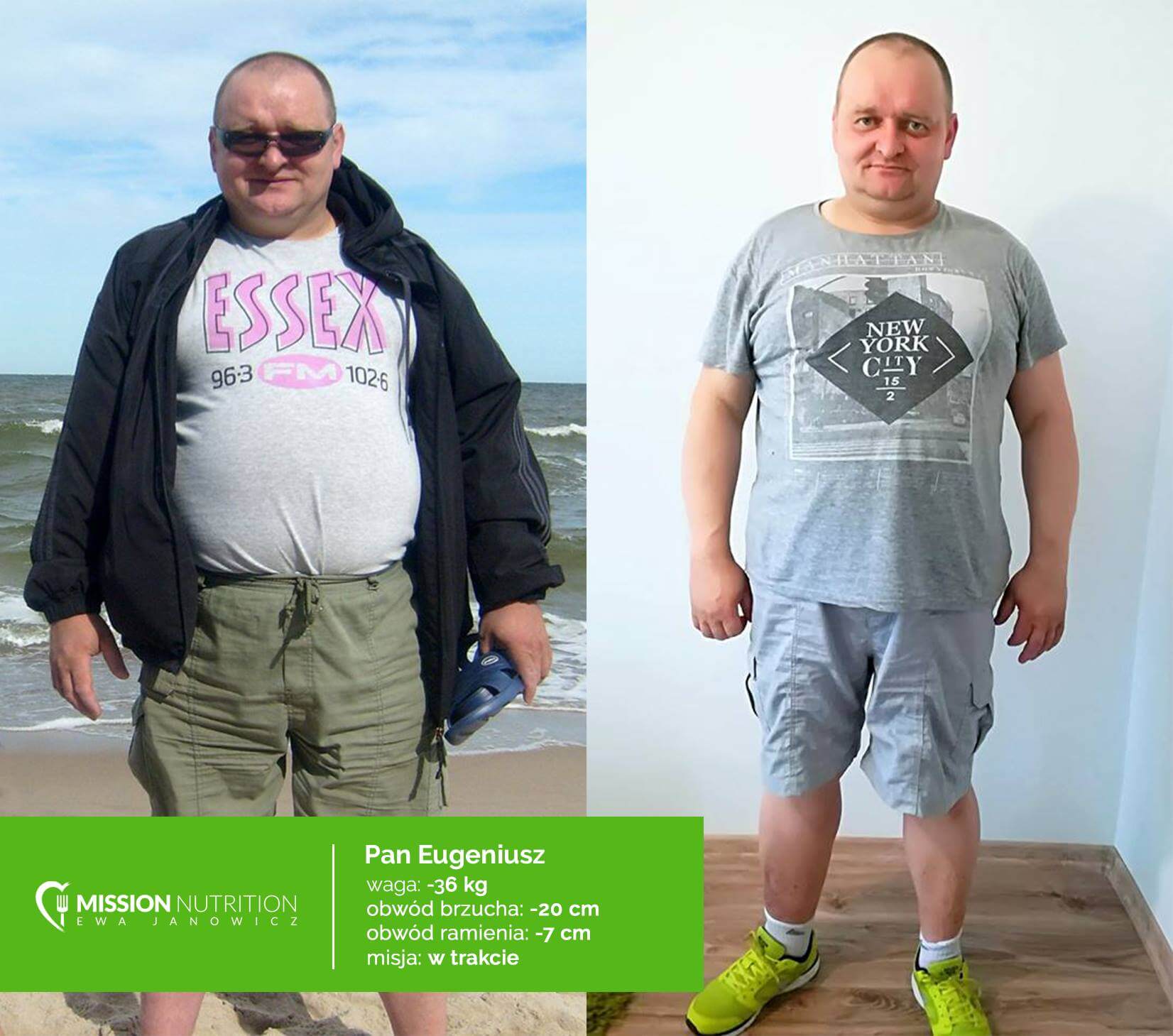 Jego walka ze zbędnymi kilogramami trwa od 9 miesięcy. Panu Eugeniuszowi udało się pozbyć do tej pory aż 36 kg zbędnej tkanki tłuszczowej. Osiągnięte efekty są imponujące i już przyczyniły się do poprawy zdrowia Pana Gienka. Można powiedzieć, że traci On kilogramy a zyskuje więcej energii i motywacji do dalszej pracy. Aktualnie pracujemy nad osiągnięciem nowych celów wagowych. Pan Gienek jest osobą sympatyczną, zdyscyplinowaną i pozytywnie nastawioną na sukces. Proszę trzymać mocno kciuki za Jego dalszą metamorfozę 🙂 .